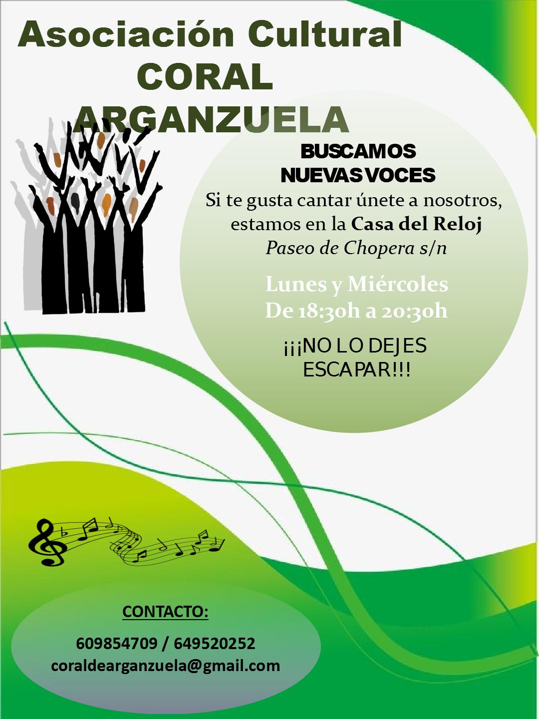 La Coral Arganzuela comenzó en el año 1988 gracias al entusiasmo por la música de algunos vecinos del distrito de Arganzuela cuya Junta Municipal apoya su labor cediendo la sala de ensayo en el Centro Cultural Casa del Reloj.